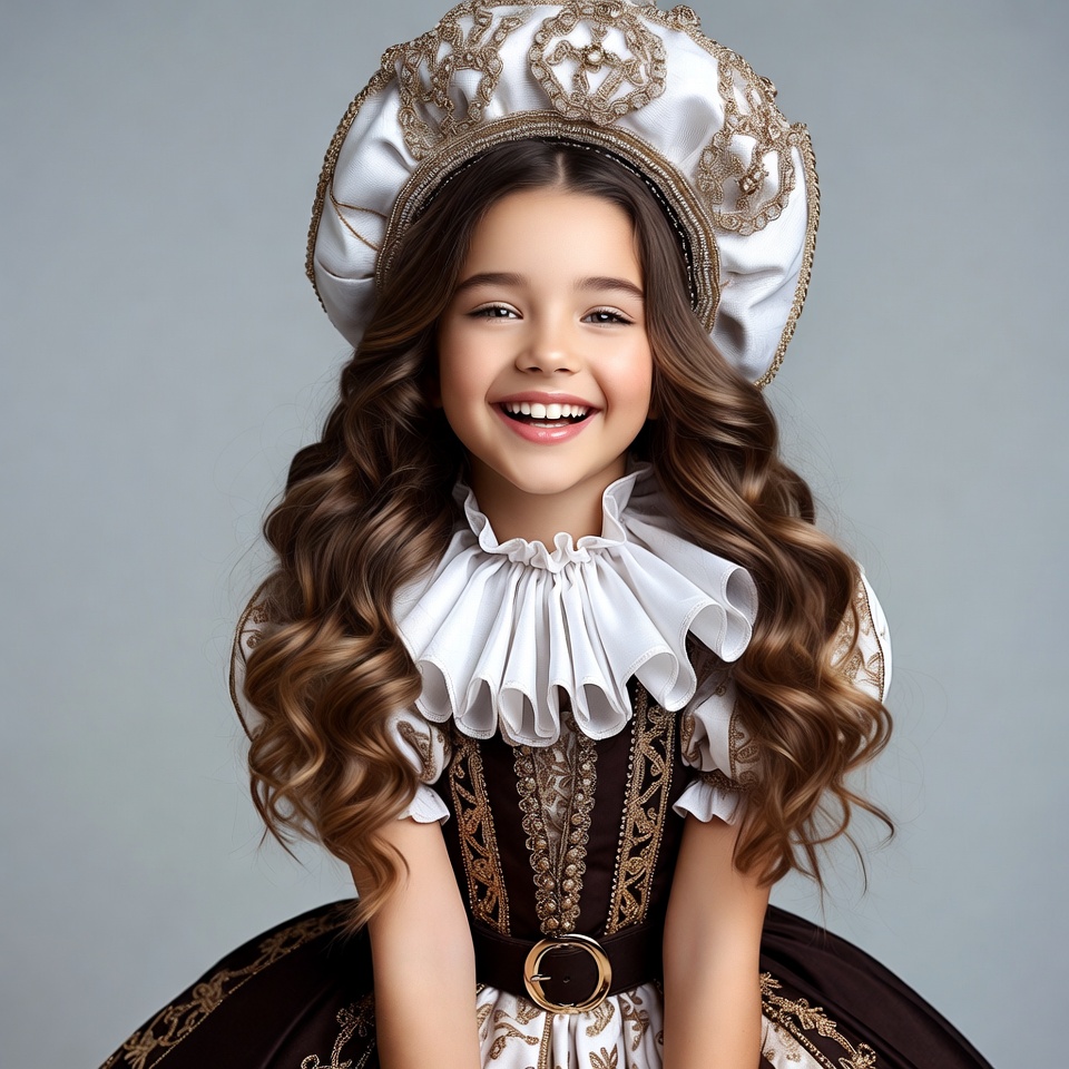 A young girl with long curly brown hair smiles happily while wearing an elaborate white kokoshnik headdress adorned with gold embroidery. She is dressed in a historical brown and gold Russian royal gown featuring a white ruffled collar and puffed sleeves. The portrait is set against a plain gray background.