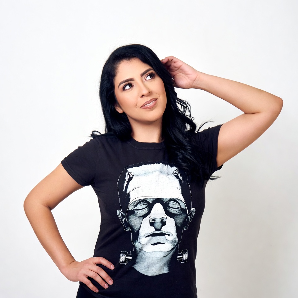 Frankenstein monster, Frankenstein t-shirt, Halloween shirt, Latina, black t-shirt, dark eyes, female, graphic tee, hand on head, isolated background, long dark hair, portrait, short sleeves, smiling, tan skin, thinking pose, wavy hair, white background, young woman, woman
