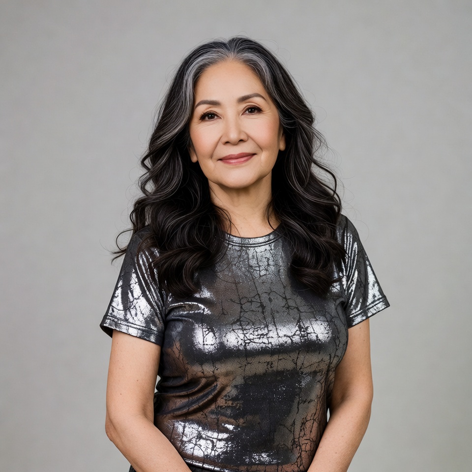 A mature Asian woman with long wavy hair streaked with silver stands smiling against a plain gray background. She wears a shiny metallic silver short-sleeved top that accentuates her figure. Her expression is warm and confident with subtle makeup.