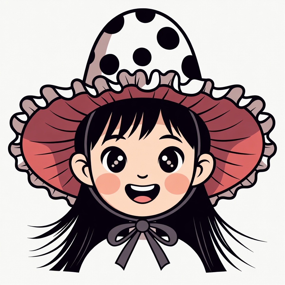 A cute anime girl with large sparkling eyes and long black hair smiles happily. She wears a wide-brimmed red hat with white polka dots and ruffled edges. Her face features rosy cheeks and a big grin on an isolated white background.