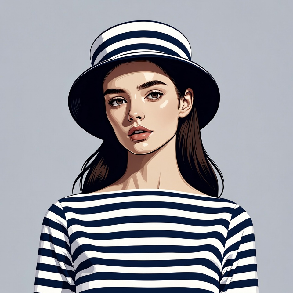 A young woman with long brown hair wears a black and white striped boat hat and matching striped shirt. She has a subtle makeup look with glossy lips and stands against a plain gray background. The digital illustration features clean lines and soft shading on her face.