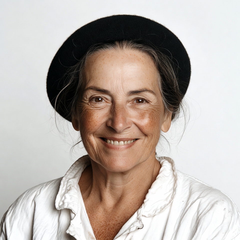 A mature White woman with graying hair smiles warmly at the camera. She wears a black beret tilted on her head and a white collared shirt. The portrait is set against a plain white background.