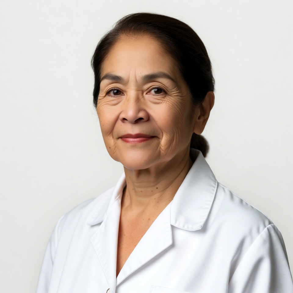 An elderly Asian woman with dark hair pulled into a ponytail smiles at the camera. She wears a white lab coat with a collared shirt underneath. The image is a close-up portrait against a plain white background.