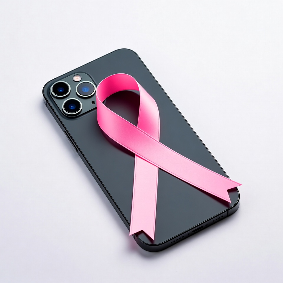 awareness ribbon, black iPhone, breast cancer, cancer awareness, healthcare, iPhone 14, isolated, mobile phone, phone accessory, pink bow, pink ribbon, ribbon, smartphone, support, symbolic, triple camera, white background, iPhone