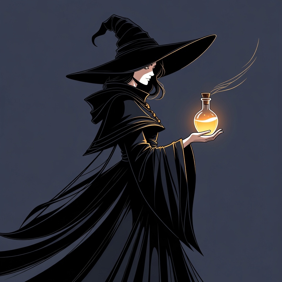 A young woman dressed as a witch in a black pointed hat and flowing cloak holds a corked glass bottle emitting orange glowing smoke. She stands against a dark background with her hair flowing and eyes focused on the potion. The illustration features dramatic lighting from the luminous vial.
