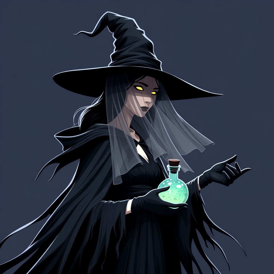 A female witch with long dark hair and glowing yellow eyes wears a wide-brimmed black hat and flowing black robe with a sheer veil. She holds a glass vial containing glowing green liquid in her black-gloved hand. The illustration features a dark background, emphasizing her mystical appearance.