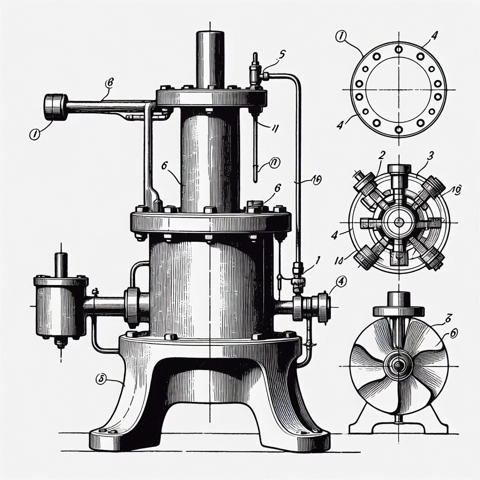 components, crosshatch, cylinder, diagram, engineering, fan wheel, gear, historical, illustration, industrial, isolated background, labeled parts, line art, machine, machinery, mechanical, piston, technical drawing, valve, vintage, steam engine