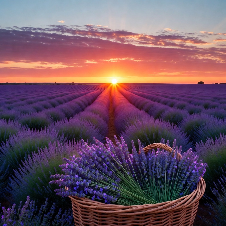 Provence lavender, agricultural field, blooming lavender, field landscape, floral field, flower basket, flower harvest, golden hour, horizon sun, lavender bouquet, lavender flowers, lavender plants, lavender rows, nature landscape, orange sky, pink clouds, purple flowers, purple sky, rural field, scenic sunset, summer field, sun rays, sunset, vibrant sunset, wicker basket, lavender field