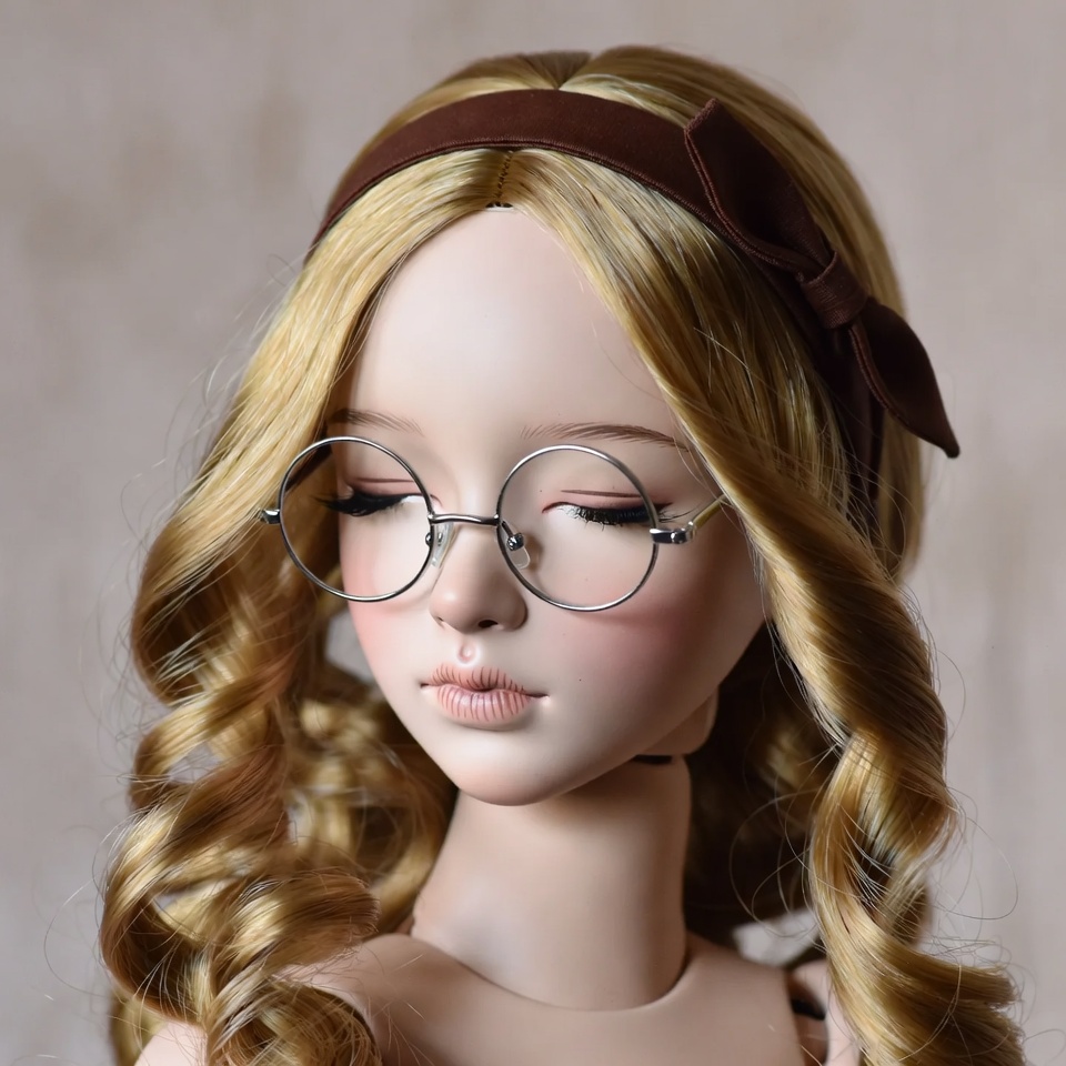 White, anime doll, bjd, blonde hair, bow, brown headband, closed eyes, collectible doll, cute doll, doll, glasses, headband, illustration, isolated background, pink blush, porcelain skin, round glasses, wavy hair, woman, ball jointed doll