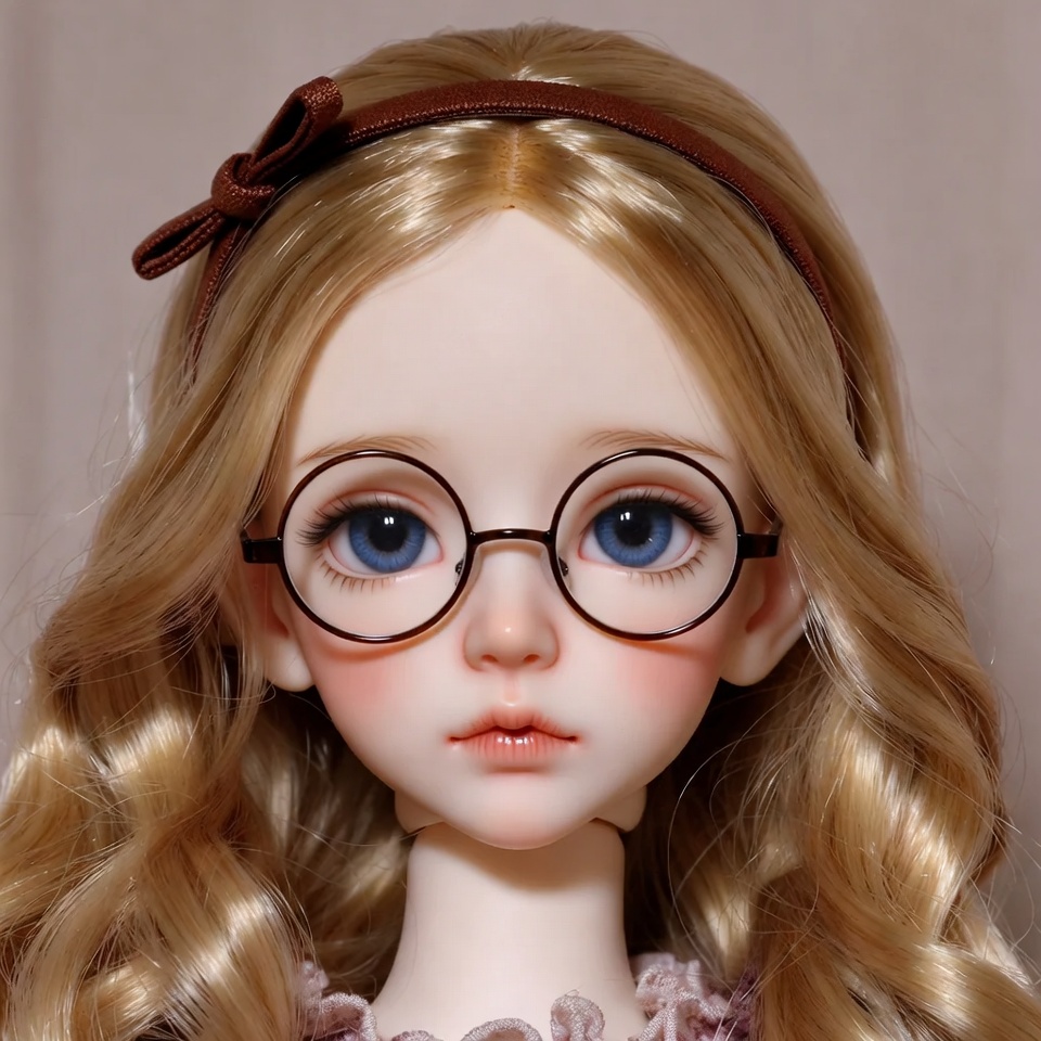 Asian doll, ball jointed doll, blonde hair, blue eyes, bow, closeup, doll face, doll portrait, fair skin, female doll, glasses, headband, illustration, isolated background, pink blush, porcelain doll, round glasses, toy doll, wavy hair, woman doll, BJD doll