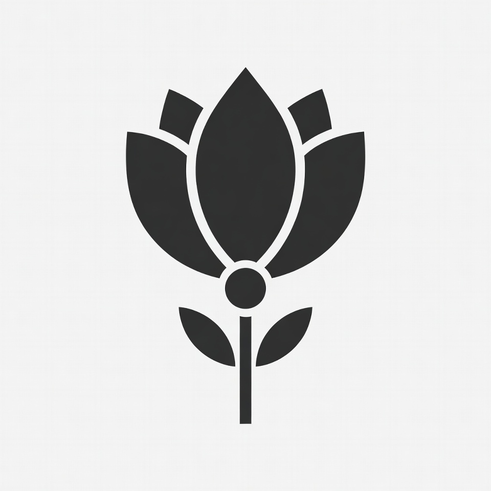 A minimalist black lotus flower icon features symmetrical petals and leaves on a white background. The design uses clean geometric shapes with a central circle at the base of the petals. It appears as simple vector clipart suitable for icons or graphics.