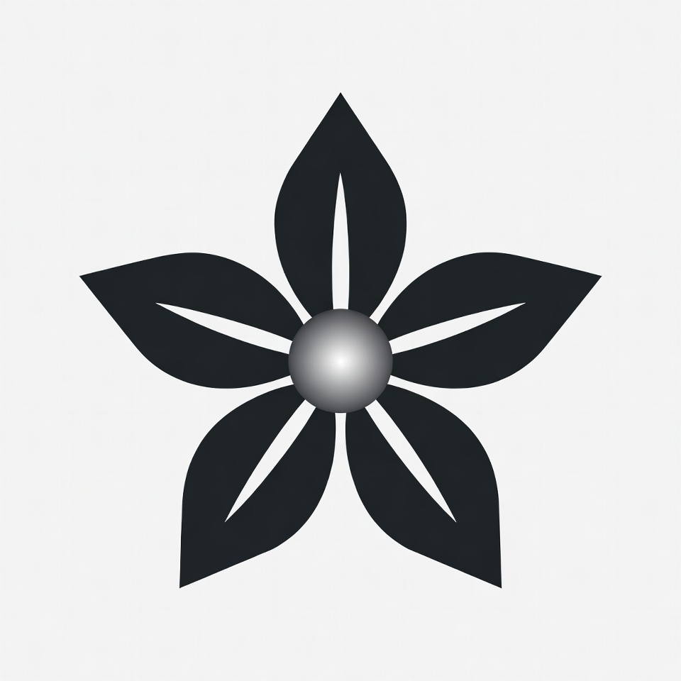 A simple vector illustration of a five-petaled flower on a white background. The petals are solid black with sharp outlines, and the center features a metallic gray circle. The design is minimalist and isolated.