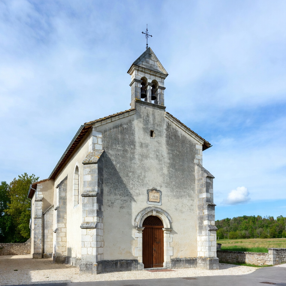 France, arched door, architecture, bell tower, blue sky, clouds, countryside, cross, fields, historic building, plaque, rural church, stone church, stone wall, trees, windows, wooden door, church