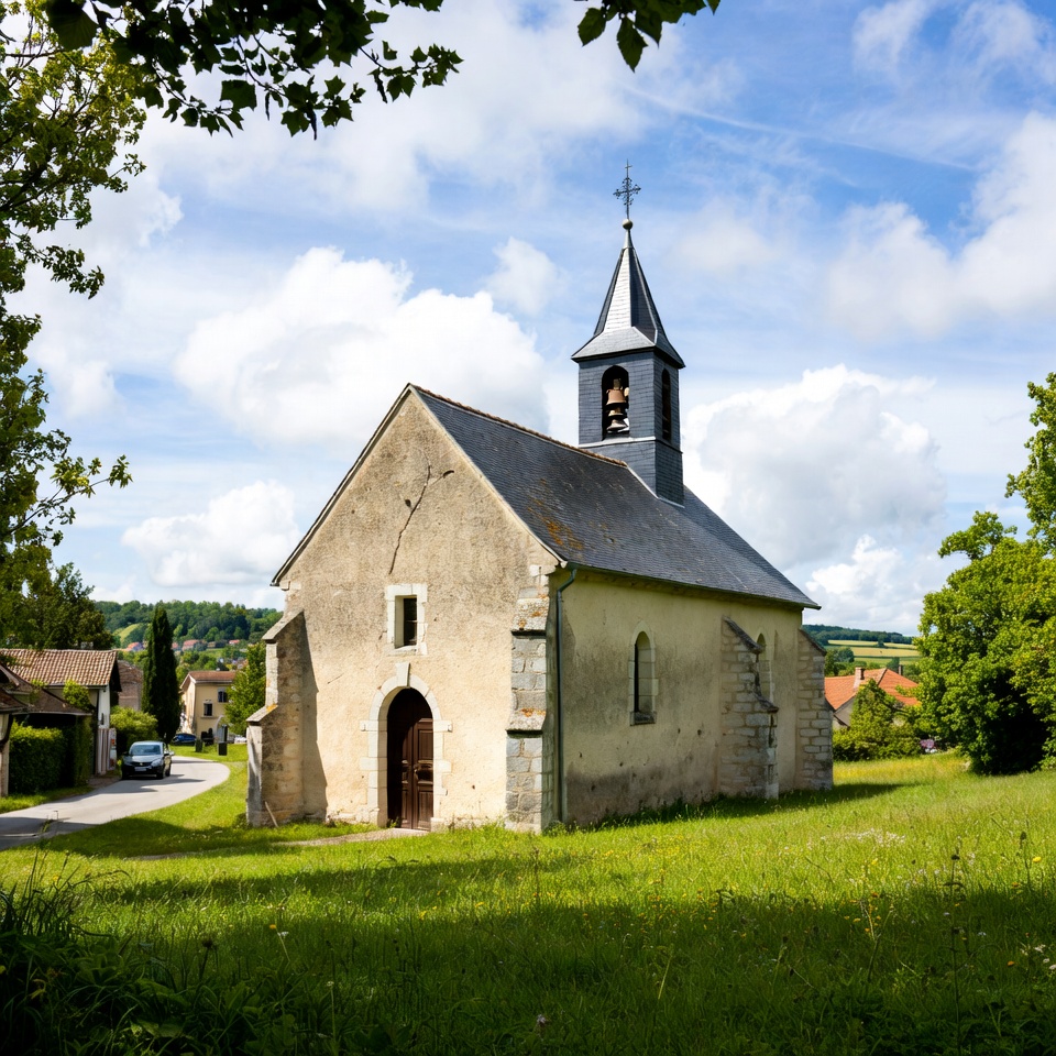 A small stone chapel with a tall pointed bell tower and cross stands in a lush green field. It features a wooden arched door, narrow windows, and a slate roof. Surrounding trees and distant village houses appear under a partly cloudy blue sky.