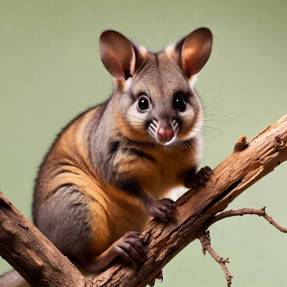 animal, big eyes, branch, cute animal, ears, fur, glider, gray fur, green background, isolated background, large eyes, marsupial, orange fur, paws, pink nose, possum, wildlife, wood, sugar glider