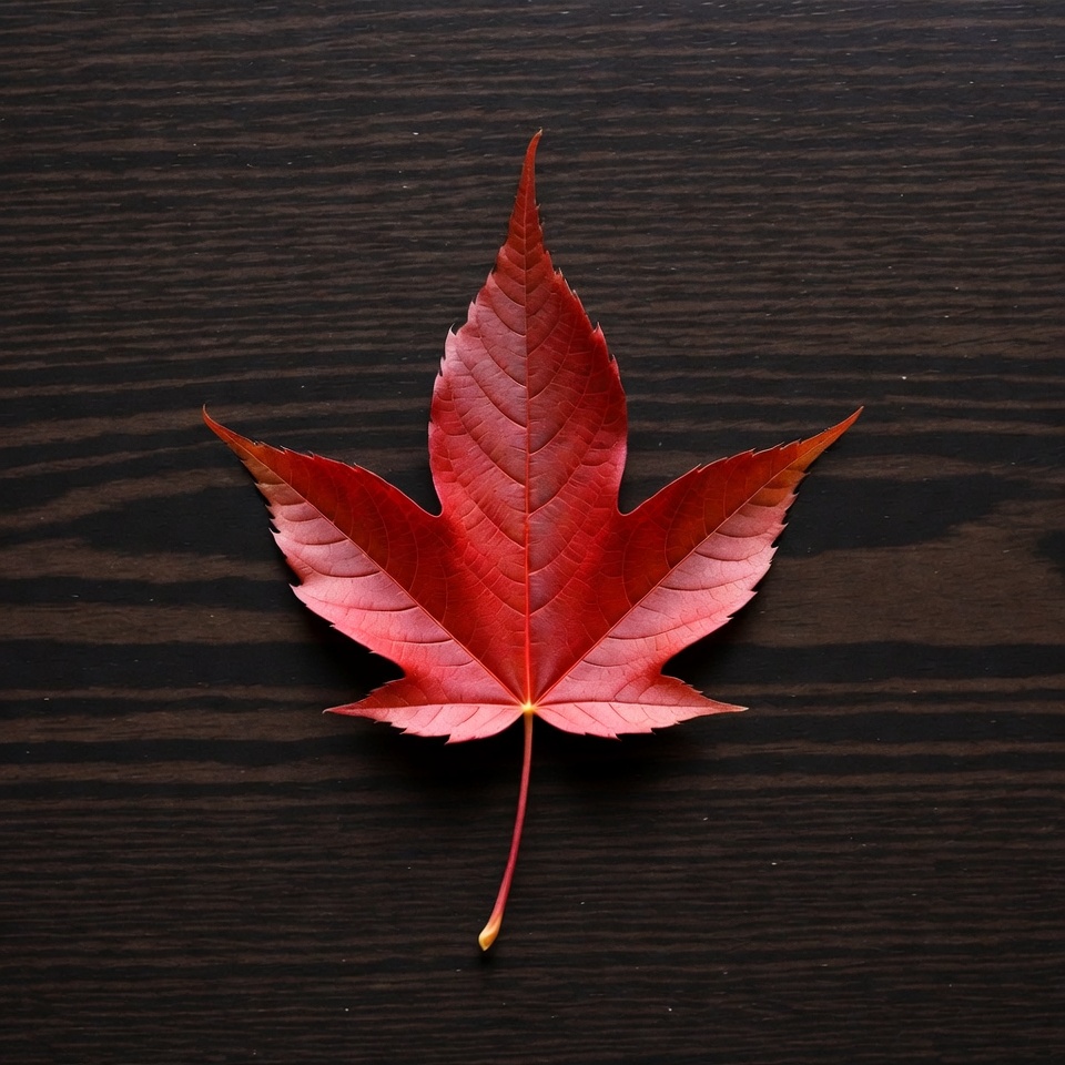 autumn leaf, dark wood, fall leaf, foliage, isolated background, leaf veins, maple leaf, nature, plant, pointed lobes, vibrant red, wooden surface, red leaf