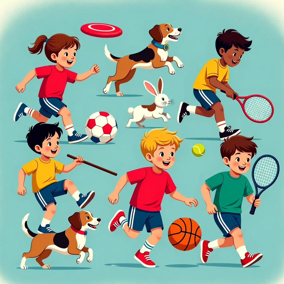 African-American, White, active, basketball, basset hound, beagle, boy, bunny, cartoon, clipart, dogs, frisbee, girl, illustration, isolated background, jumping, kids, playing, rabbit, running, soccer ball, sports, stick, tennis ball, tennis racket, children