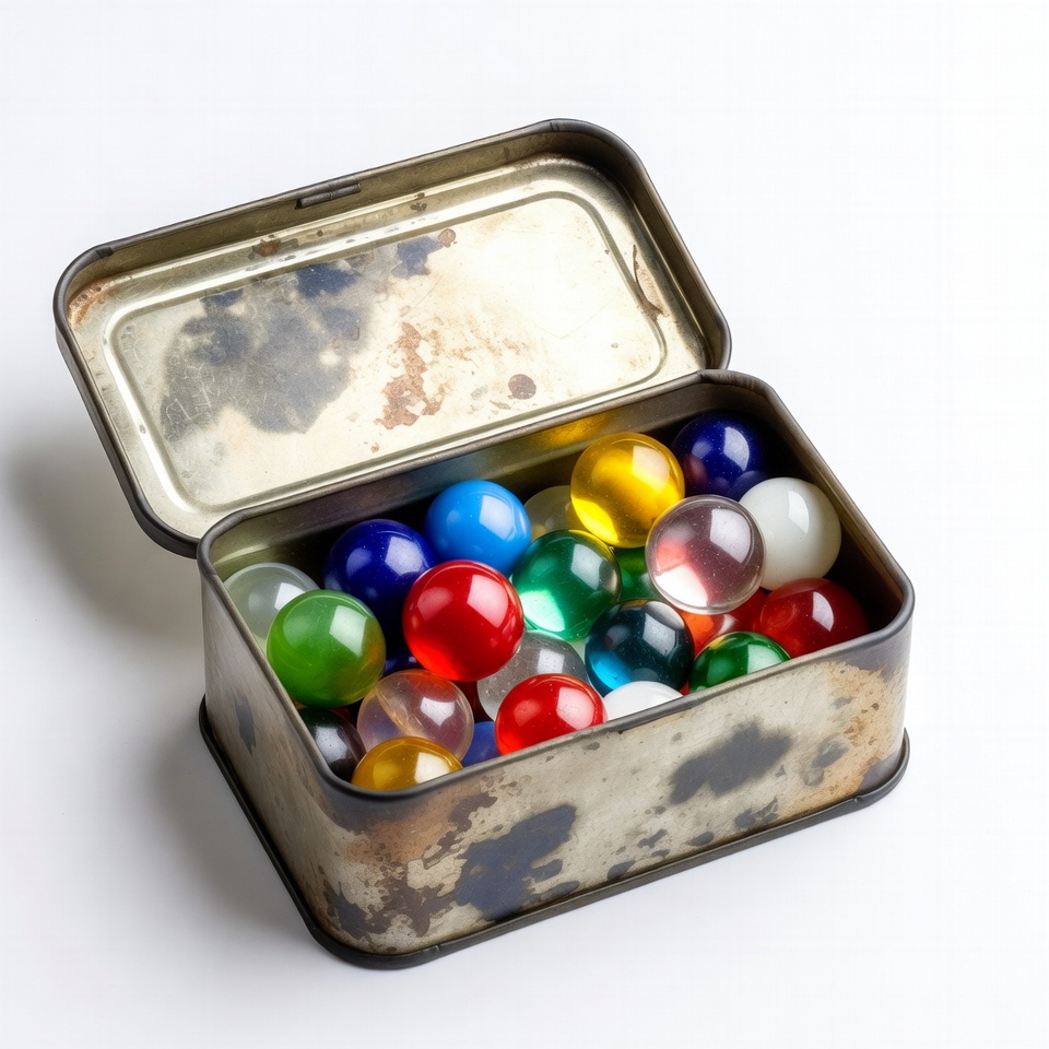 An open, vintage tin box with a rusted patina holds a collection of colorful glass marbles. The marbles feature vibrant shades of red, blue, green, yellow, clear, and white. The box sits on a plain white background.