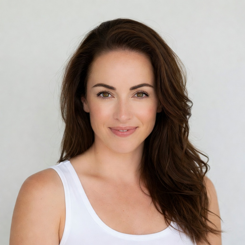 A woman with long wavy brown hair smiles at the camera against a white background. She has green eyes, defined eyebrows, and wears a white tank top. Her expression is warm and approachable.