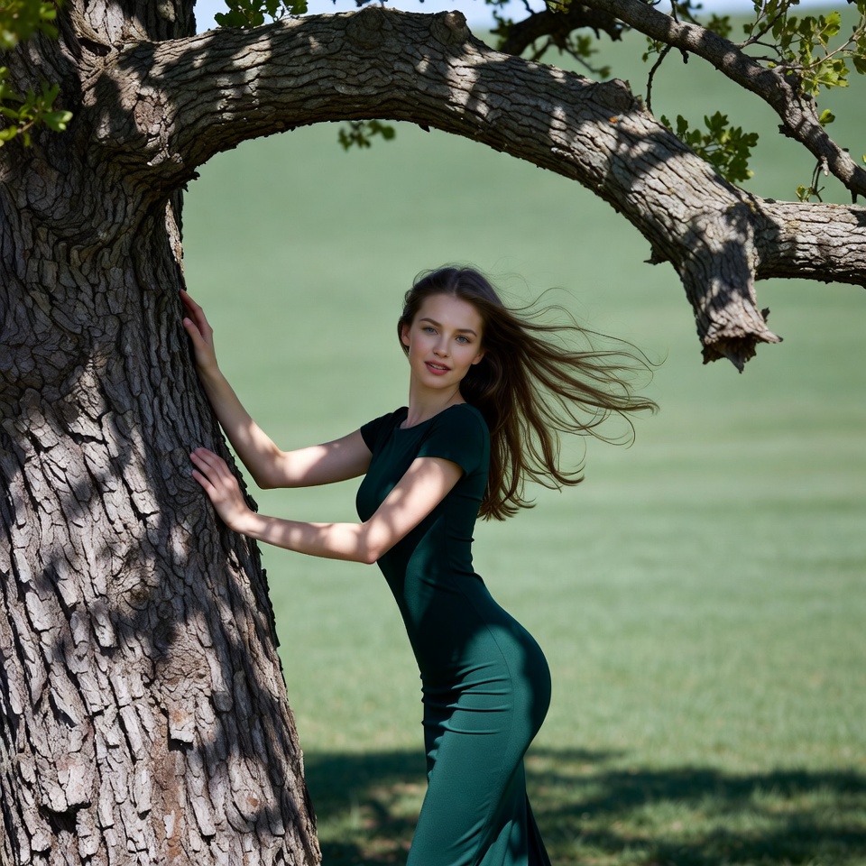 A young woman with long brown hair leans against a large oak tree with her hand on the trunk. She wears a form-fitting green dress and stands in a green grassy field under dappled sunlight. Her hair flows in the wind as she poses elegantly.