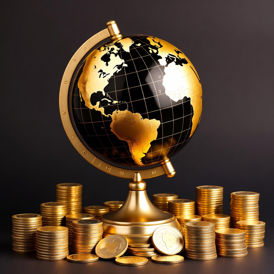 A black and gold globe sits atop a tall stack of gold coins on a dark background. The globe features a black base with golden continents and grid lines, mounted on a shiny gold stand. Surrounding the base are multiple stacks of gleaming gold coins.