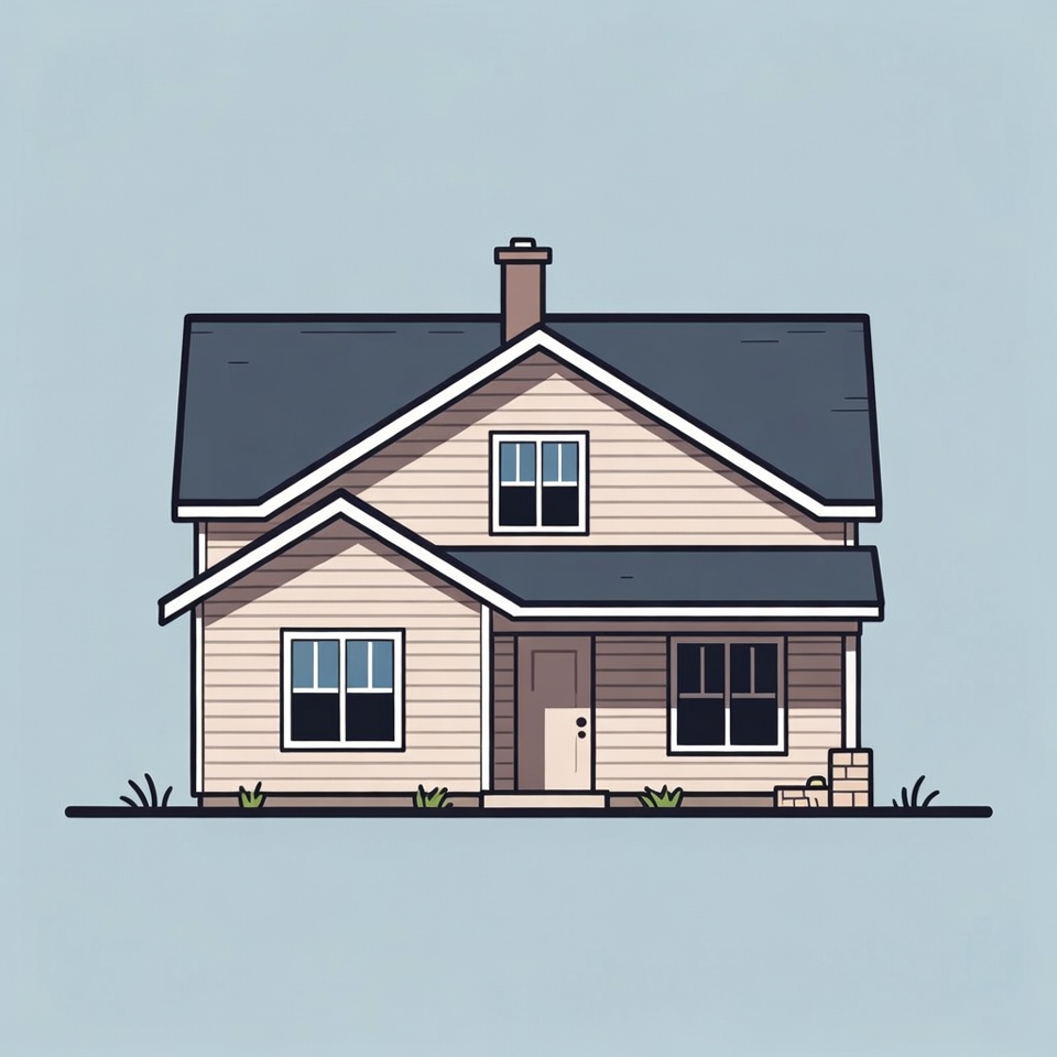A simple line art illustration of a beige house with a dark blue roof and chimney. It features white-framed windows, a front door, and small patches of grass on a light blue isolated background. The house has a porch roof over the entrance.