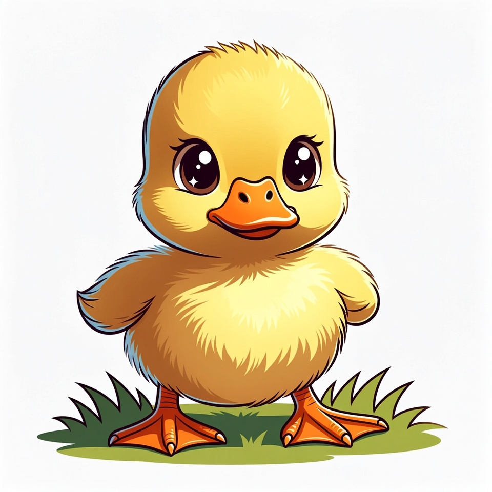 A fluffy yellow duckling with big sparkling eyes stands on green grass. It has orange webbed feet and a smiling beak. The illustration features a simple isolated background.