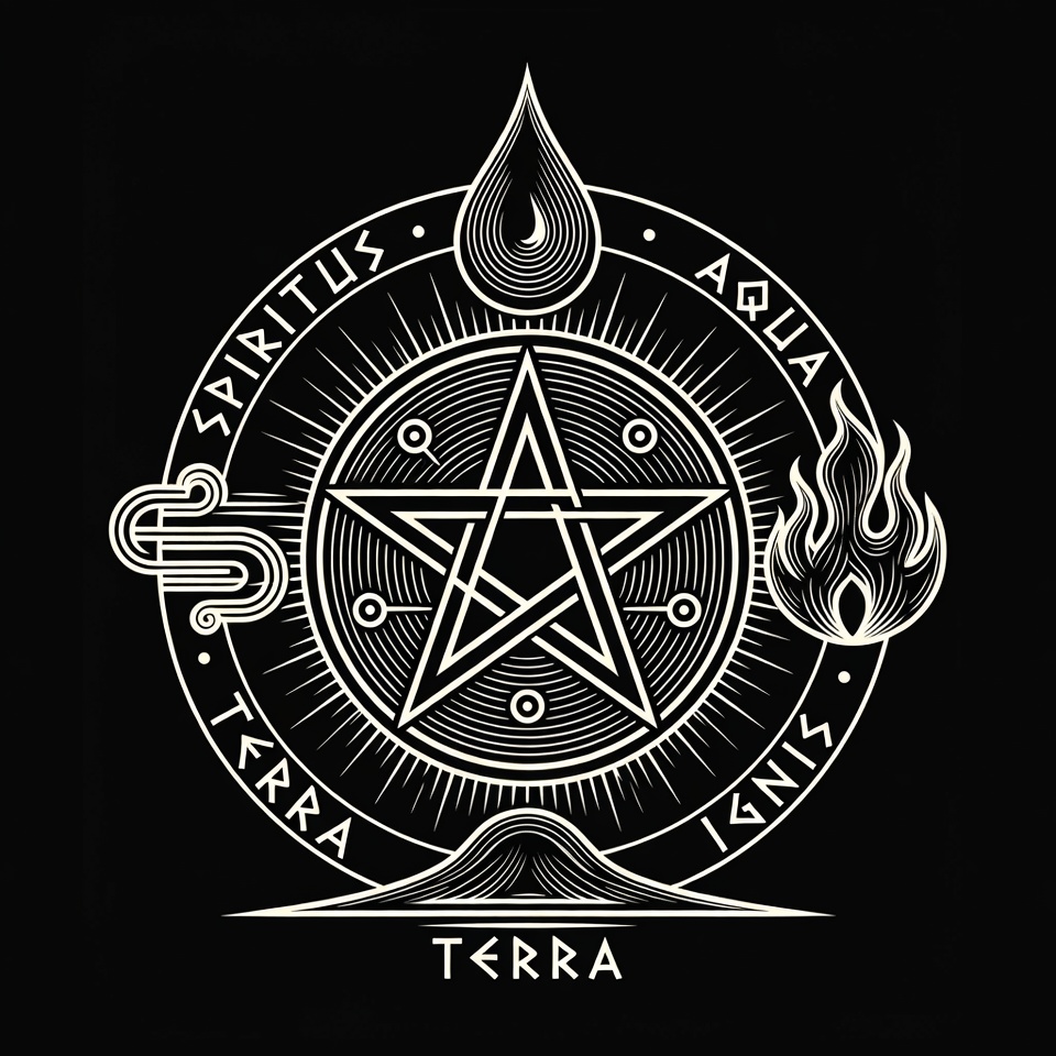 A line art illustration features a central pentagram surrounded by symbols of the four classical elements. Terra is depicted as a mountain at the bottom, Ignis as flames on the right, Aqua as a water drop on the top, and Aer as wind swirls on the left. Latin labels 'Terra', 'Ignis', 'Aqua', and 'Spiritus' encircle the radiant design on an isolated black background.