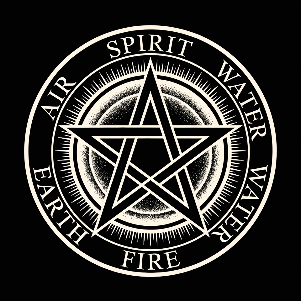 A black and white illustration features a large pentagram inside a circle. The words Earth, Air, Fire, Water, and Spirit are inscribed around the edges. Radiating lines and shading emphasize the central star and elemental symbols.