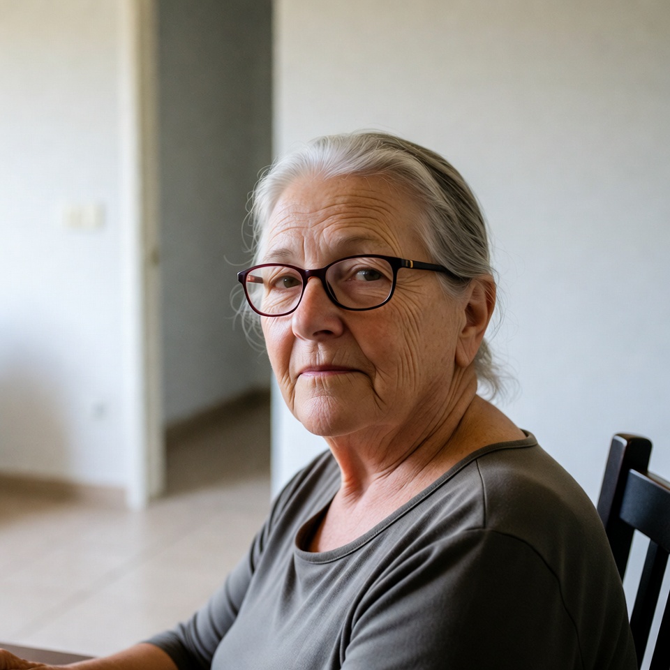 An elderly woman with gray hair pulled back sits in a wooden chair inside a room with white walls. She wears a gray top and red-framed glasses, looking directly at the camera with a neutral expression. An open door and tiled floor are visible in the background.