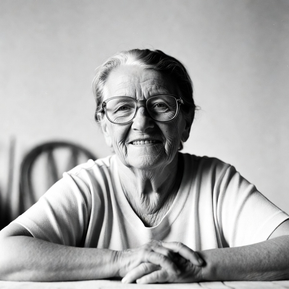 An elderly woman with gray hair pinned back wears glasses and a light shirt. She smiles warmly while sitting at a table with her hands folded in front. A wooden chair is visible in the softly lit background.