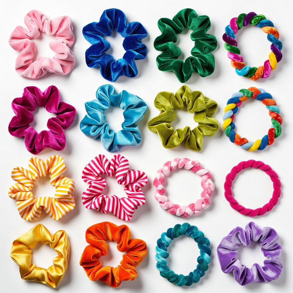 blue scrunchies, braided scrunchies, colorful scrunchies, fashion accessories, green scrunchies, hair accessories, hair ties, isolated background, pink scrunchies, purple scrunchies, striped scrunchies, velvet scrunchies, vibrant colors, white background, yellow scrunchies, scrunchies