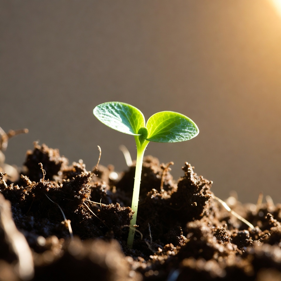 A young green seedling with two small leaves emerges from dark moist soil. Warm sunlight illuminates the sprout from behind, creating a glowing effect. The plant stem is slender and vibrant against the earthy background.