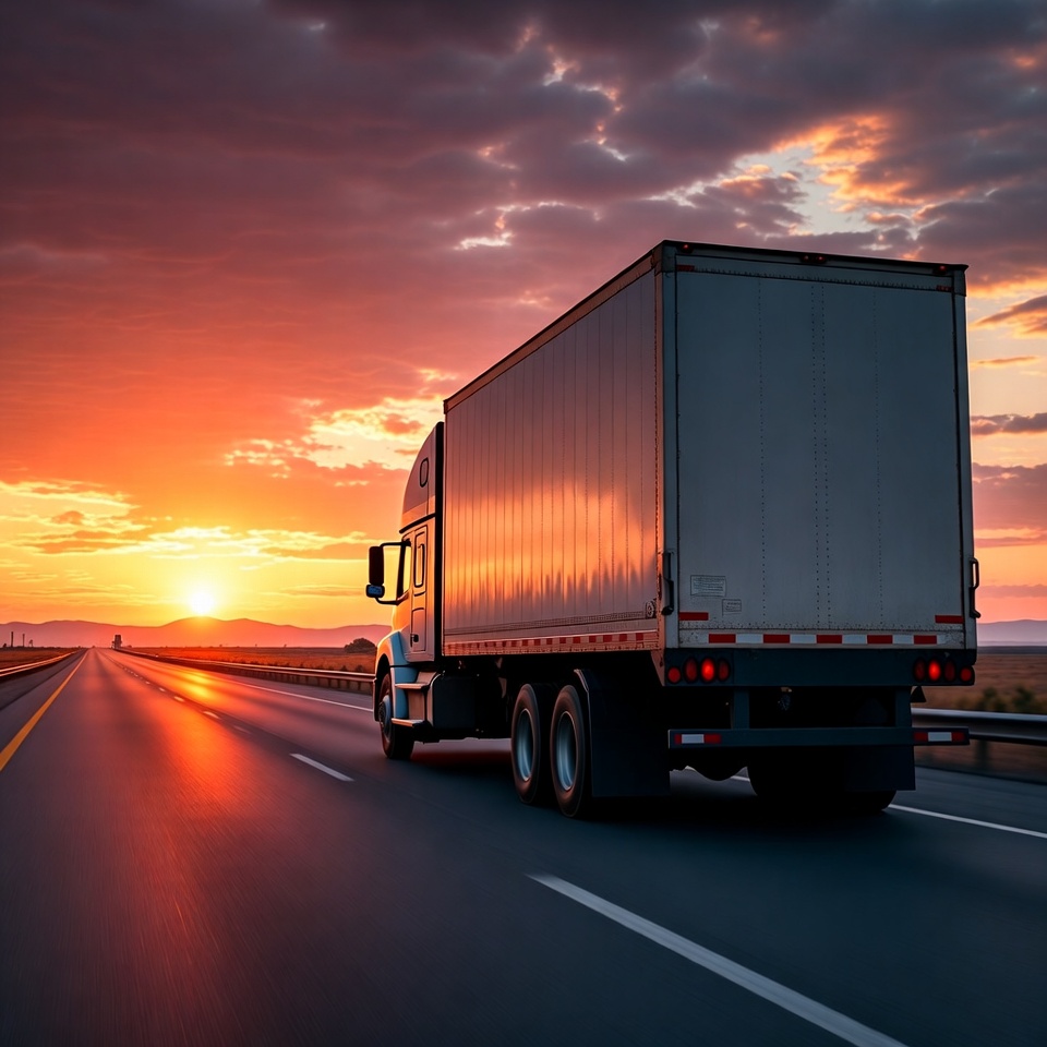 Semi Truck Driving on Highway at Sunset