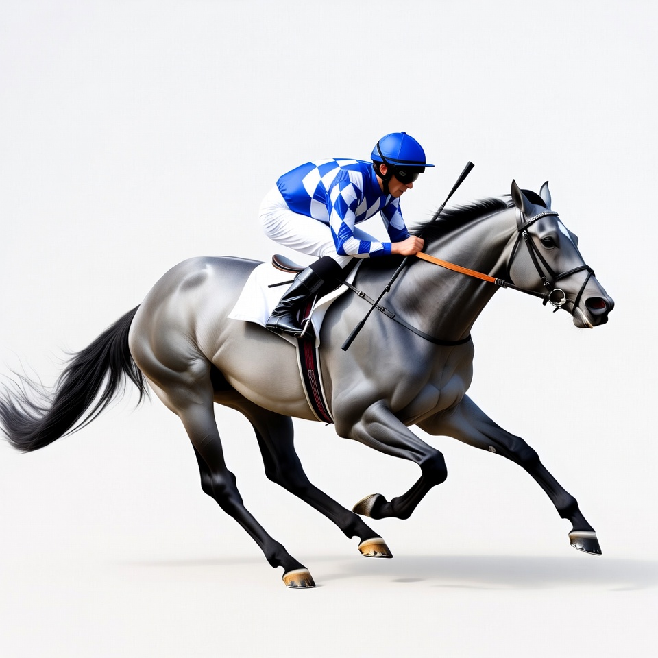 White, action, blue helmet, checkered silks, equestrian, galloping, gray horse, hooves, horse, horse racing, isolated background, male, mane, racehorse, racing, reins, riding, speed, tail, whip, white pants, jockey