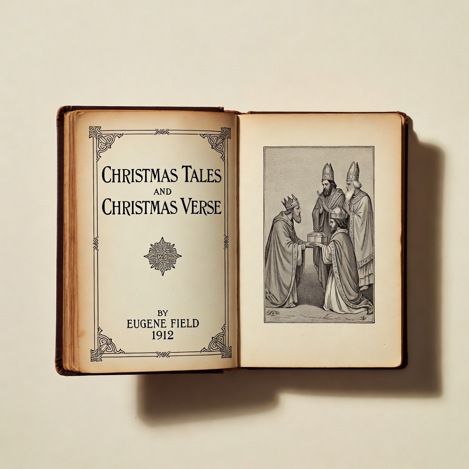 An open antique book titled 'Christmas Tales and Christmas Verse' by Eugene Field from 1912 lies on a white surface. The left page shows ornate text and decorative borders, while the right page features a black-and-white illustration of three robed kings with crowns seated around a table. The book has a brown leather cover with gold detailing.