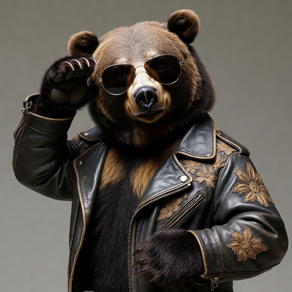 animal, anthropomorphic bear, aviator sunglasses, brown bear, cool bear, embroidered jacket, furry animal, gray background, isolated background, leather jacket, paw salute, saluting bear, stylish bear, sunglasses, bear