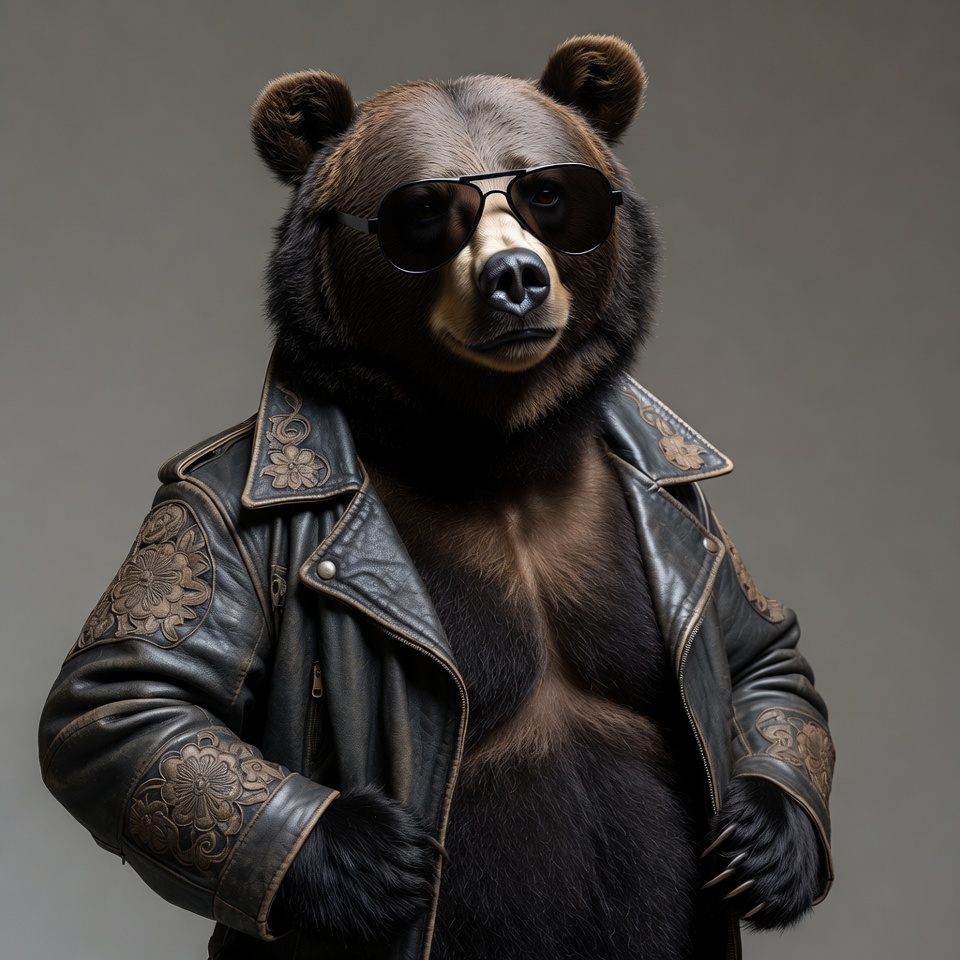 animal, anthropomorphic bear, aviator sunglasses, biker jacket, black nose, brown bear, cool bear, embroidered jacket, floral embroidery, furry animal, gray background, leather jacket, mammal, paws, portrait, standing bear, stylish animal, sunglasses, wildlife, bear