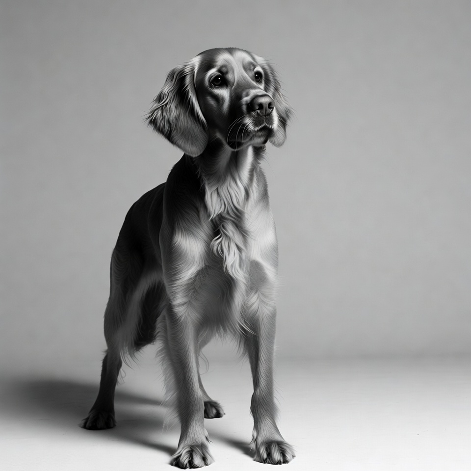 A golden retriever dog stands attentively on a plain gray background in black and white. The dog has long floppy ears, expressive eyes looking upward, and fluffy fur. Its pose is upright with front paws together and tail slightly raised.