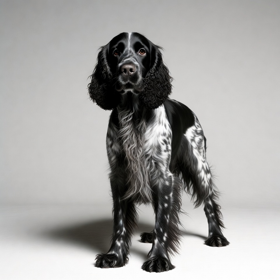 A black and white English Springer Spaniel stands alert on a plain gray background. The dog has curly ears, a spotted coat, and expressive brown eyes. Its fur is fluffy and detailed around the legs and chest.