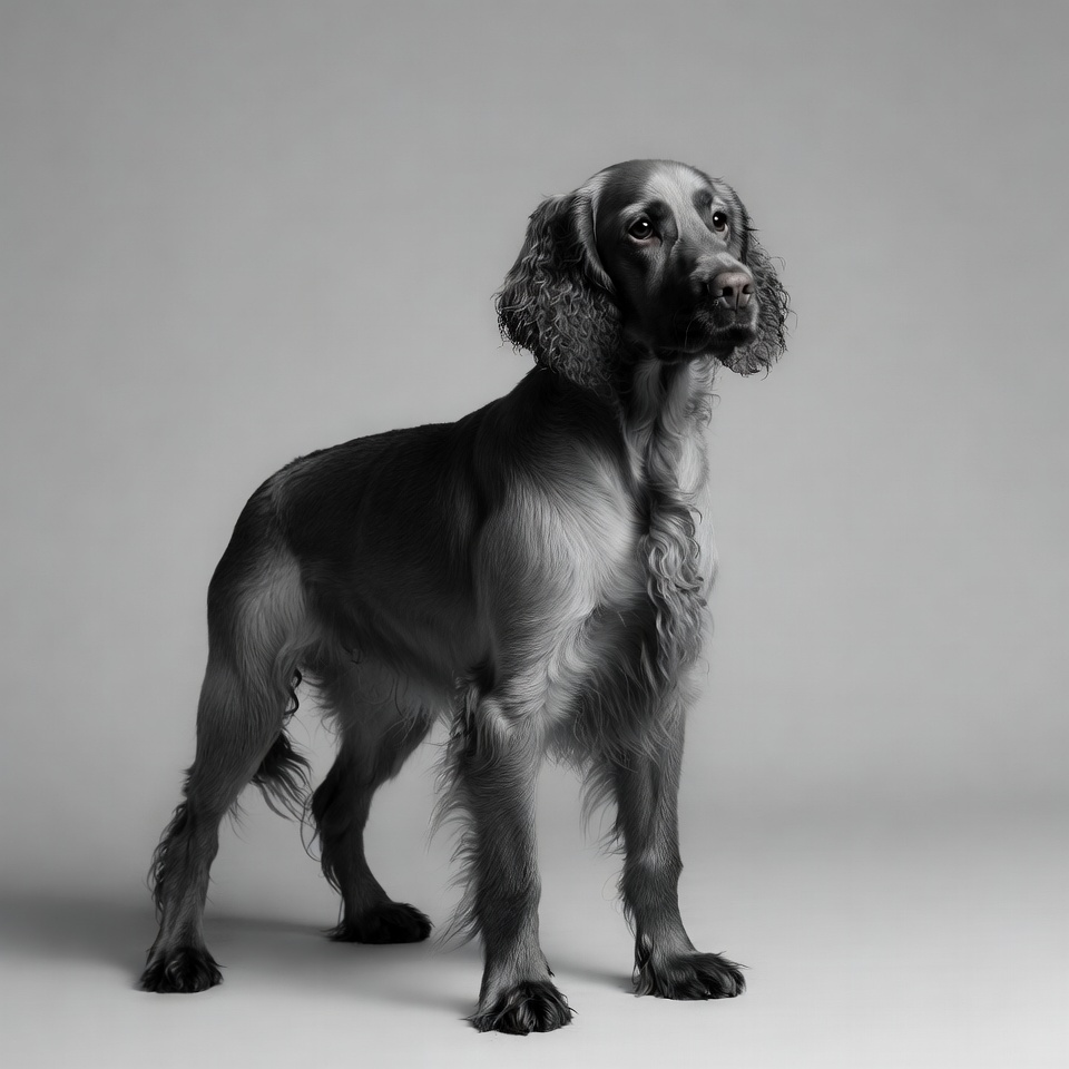 English cocker spaniel, animal, black dog, canine, curly fur, dog, fluffy dog, gray background, isolated, long ears, pet, purebred dog, side view, spaniel, standing dog, cocker spaniel