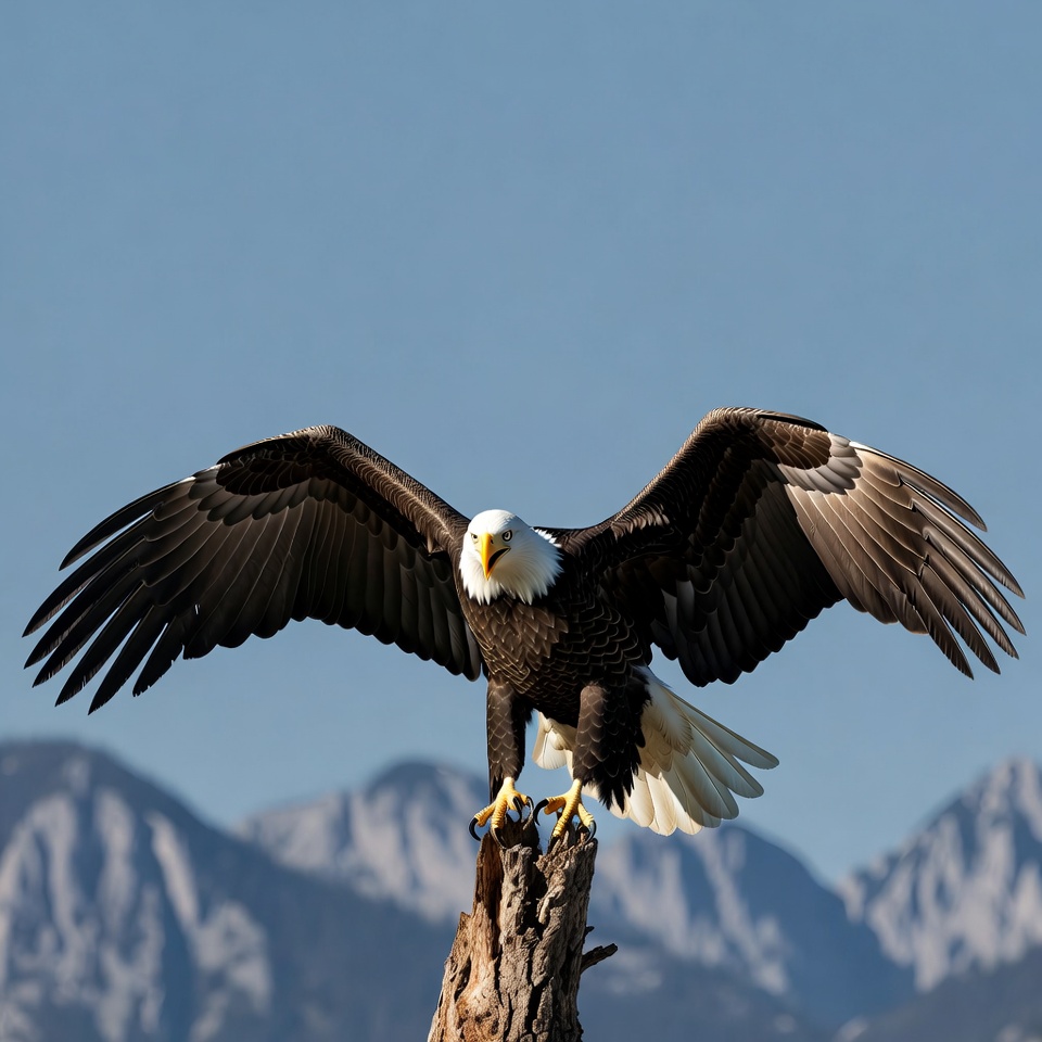 A majestic bald eagle stands on a weathered tree stump with its wings fully extended. The eagle has a striking white head, yellow beak, and dark feathers, gazing forward intently. Snow-capped mountains rise in the background under a clear blue sky.