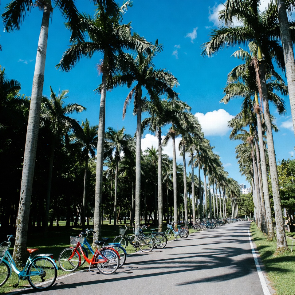 asphalt path, bicycles, bike rack, bikes, blue sky, clouds, green grass, lush greenery, nature, outdoor, palm fronds, park, parked bikes, pathway, pathway lined trees, road, row of trees, sunny day, tall trees, trees, tropical park, tropical trees, palm trees