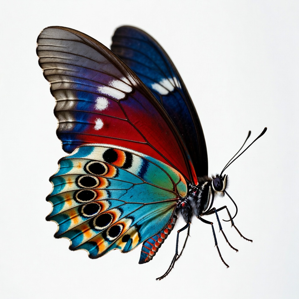 A vibrant butterfly with multicolored wings displays intricate patterns of blue, red, green, and orange hues. The wings feature white spots and eye-like markings. It is positioned against a plain white background.