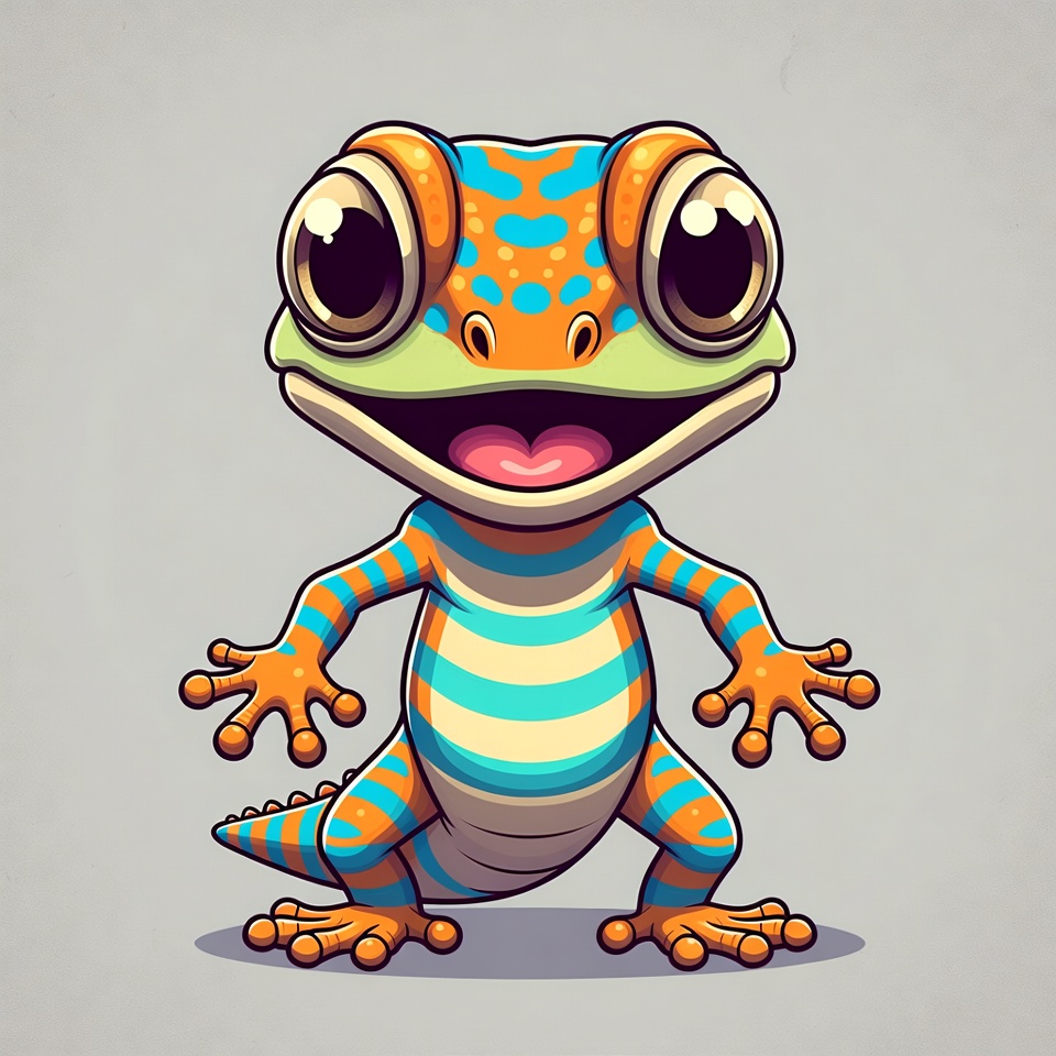 A vibrant cartoon gecko with large orange eyes and colorful blue, orange, and green patterns stands on a gray background. It has a wide smiling mouth, striped belly, and outstretched arms with clawed hands. The illustration features a playful, chibi-style design.