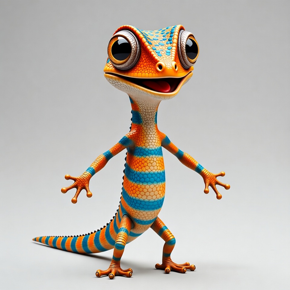 A vibrant 3D rendered gecko stands on a plain background with large expressive eyes and a wide smiling mouth. Its body features orange and turquoise stripes and patterns, with outstretched arms and a long tail. The illustration has a playful, cartoonish style.