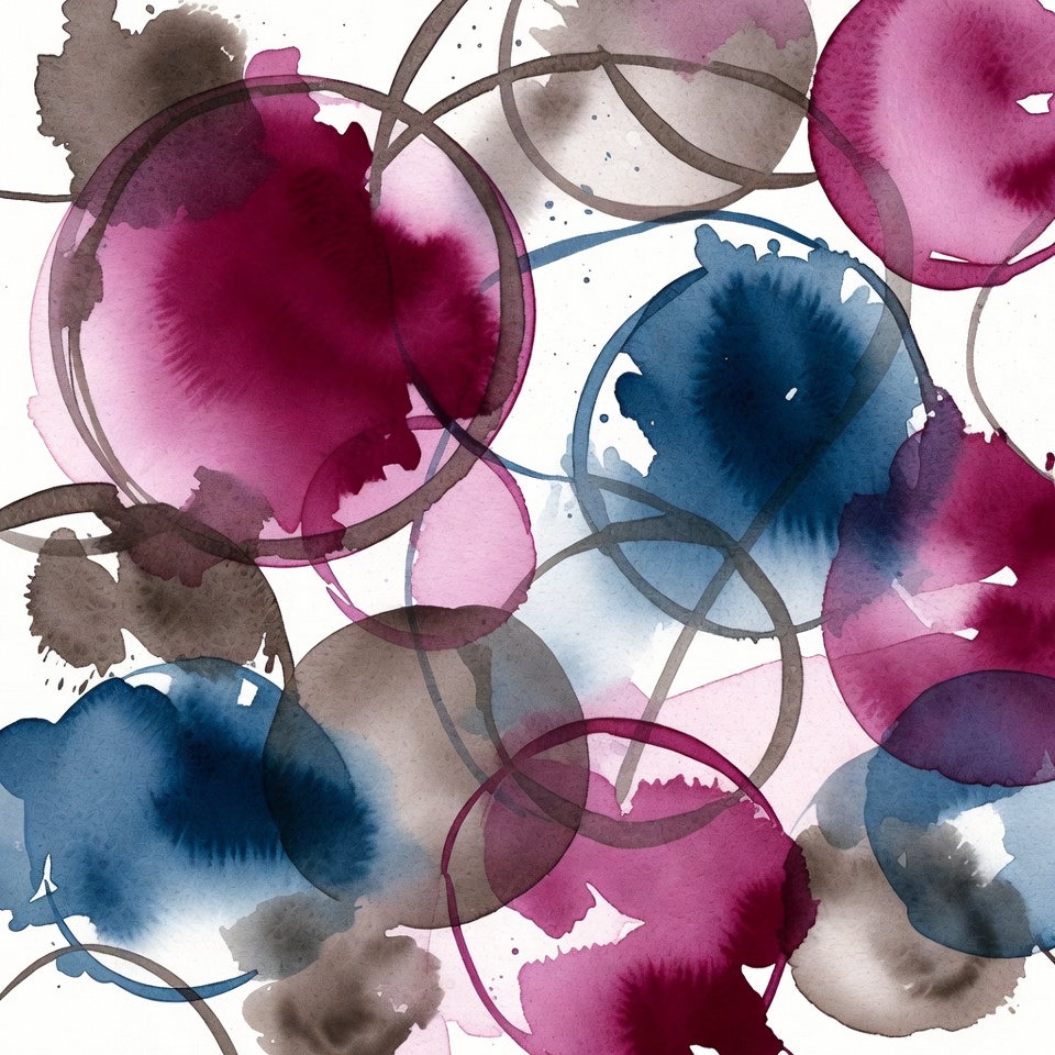 An abstract artwork features overlapping watercolor circles in shades of pink, purple, blue, gray, and brown. Irregular splashes and drips add texture and movement across a white background. The fluid shapes blend seamlessly, creating a dynamic composition.