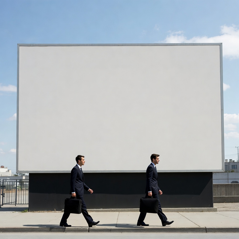 Two men in dark suits and ties carry black briefcases while walking side by side on a sidewalk. They pass a large blank white billboard mounted on a concrete structure under a clear blue sky with scattered clouds. Both men have short dark hair and stride purposefully forward.