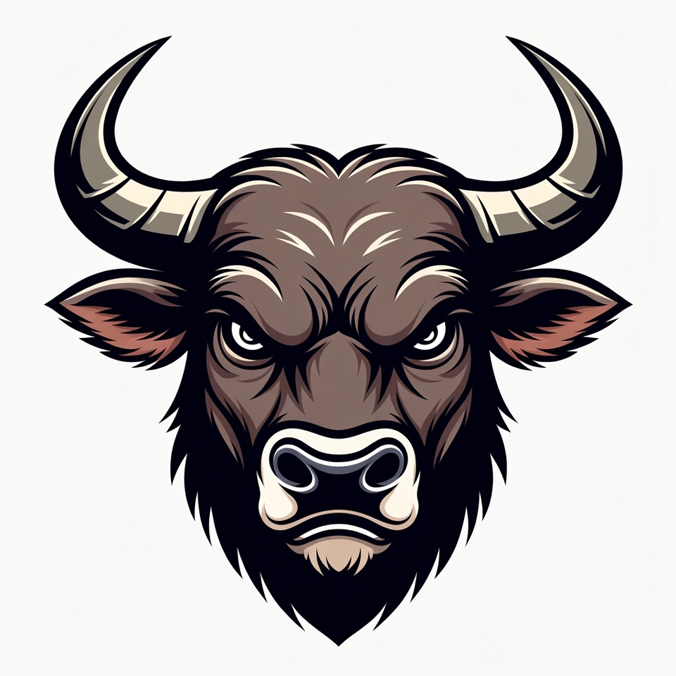 aggressive bull, angry bull, animal, brown bull, bull face, bull head, clipart, curved horns, digital art, farm animal, fierce bull, graphic design, horns, isolated background, mascot, power, strength, vector illustration, wild animal, bull