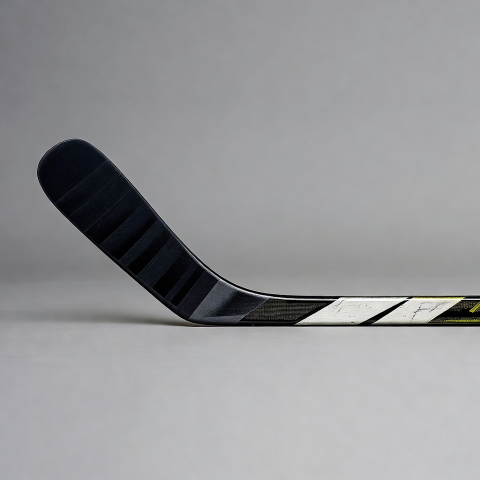 angled view, black stick, blade, composite stick, field hockey, gray background, hockey equipment, ice hockey, isolated background, shaft, sports equipment, sports gear, white stripes, yellow accents, hockey stick